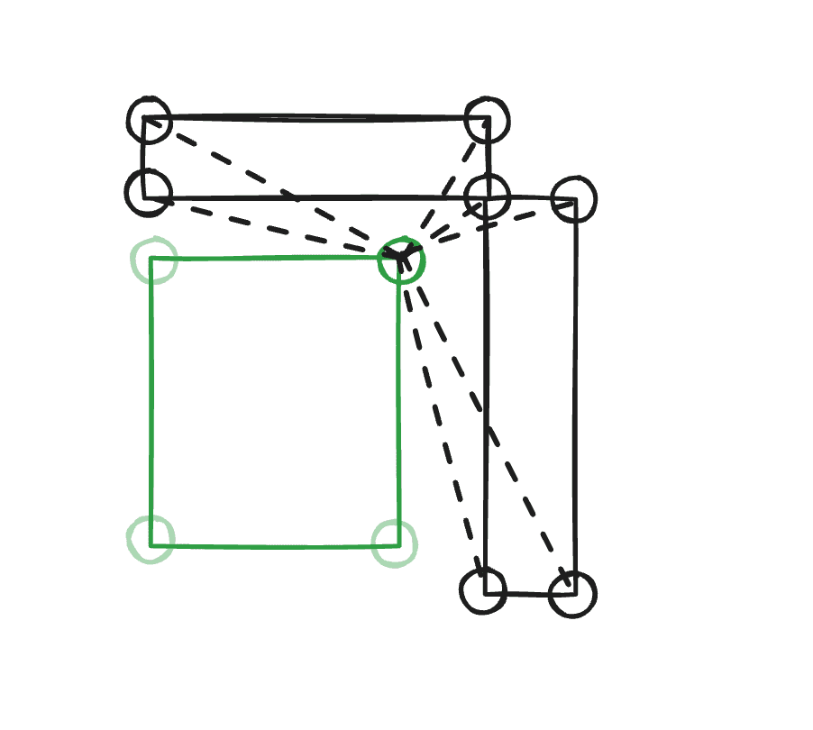 This sounds good but falls over in a common use-case. Consider placing an item in the corner of a room (the walls are representd by the black rectangles). Initially we snap to the top wall. As we drag the item to the right eventually we get close enough that we snap to the right wall instead. Another movement up has us snap to the top wall instead. This can lead to some jarring jumping around as you try to position an item in a corner. Worse than that, you're unlikely to ever get the object exactly in the corner because we only ever snap to a single other item. Room corners are made up of two items (walls) and so we never get the behaviour we want.